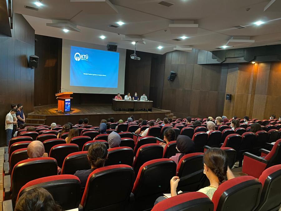 T.C. Cumhurbaşkanlığı İnsan Kaynakları Ofisi “Staj Seferbirliği Programı” Kapsamında KTÜ Kariyer Merkezi ve KTÜ-TTM iş birliğinde düzenlenen “Girişimcilik ve Şirketleşme Süreçleri” konulu eğitim Proje Uzmanı Eren YILMAZ’ın sunumu ve 64 stajyer öğrencinin katılımıyla 20 Ağustos 2021 tarihinde Osman Turan Kültür ve Kongre Merkezi’nde sosyal mesafe ve hijyen kurallarına uygun bir şekilde gerçekleştirildi.