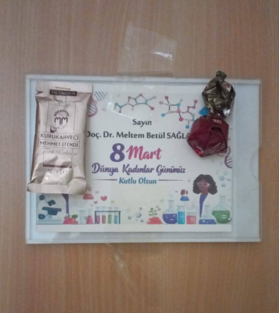 "Çalışanlara yönelik düzenlenen sosyal, kültürel ve sportif etkinlik sayısı" kapsamında 8 Mart Dünya Kadınlar Günü dolayısıyla KTÜ Kimya Bölümü yönetimi tarafından bölümde görev yapan kadın personel için anlamlı bir sürpriz hazırlandı. Günün anlam ve önemine dikkat çekmek amacıyla hazırlanan tebrik kartları, bölümde görev yapan tüm kadın akademik ve idari personelin ofis kapılarına bırakıldı.