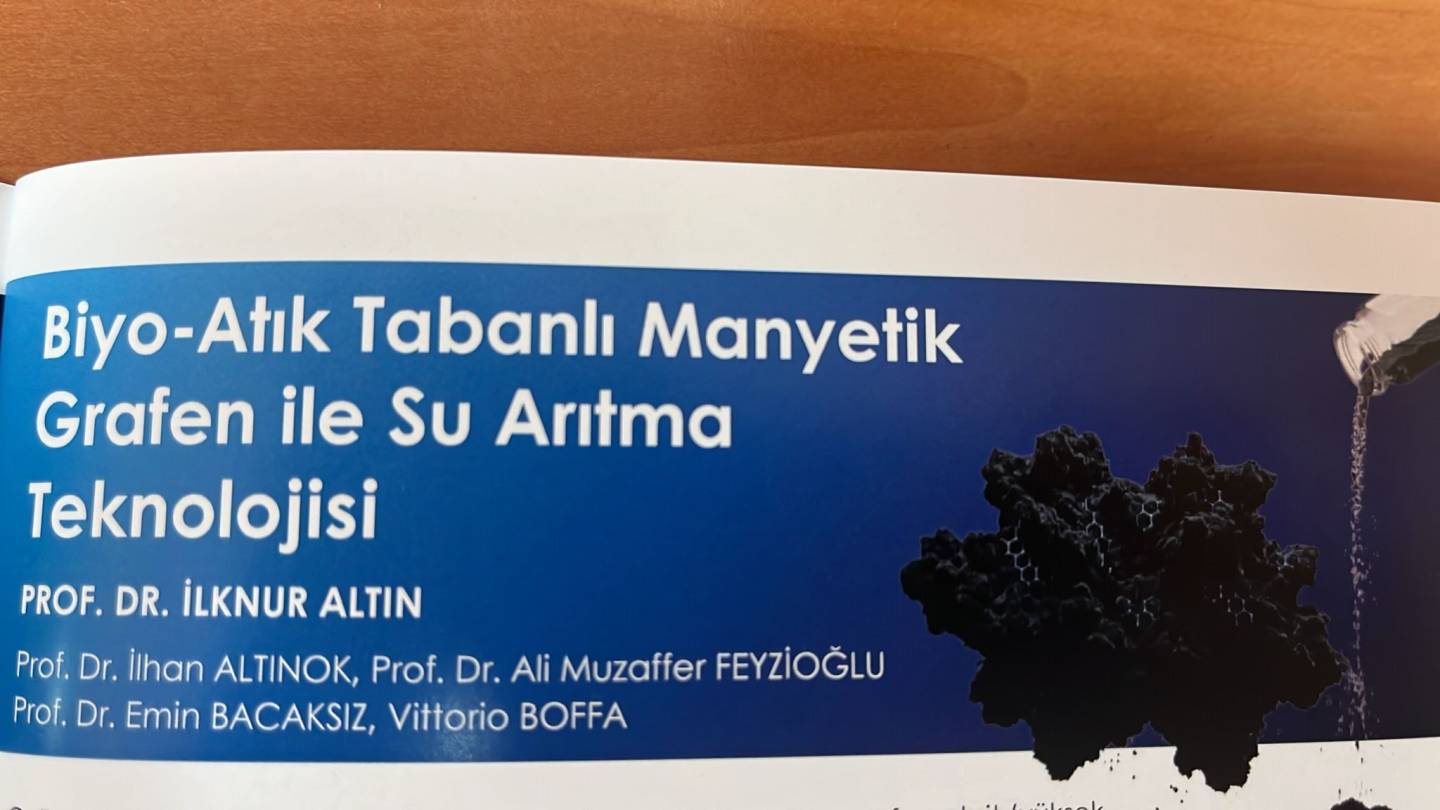 Sunumu Yapan: Prof. Dr. İlknur Altın. Patent Adı: Su Arıtımı İçin Biyo-Atık Türevli Manyetik Özelliği Sahip Grafen Malzeme. Buluşçular: Prof. Dr. İlknur Altın, Prof. Dr. İlhan Altınok, Prof. Dr. Ali Muzaffer Feyzioğlu, Prof. Dr. Emin Bacaksız, Prof. Dr. Vittorio Boffa.