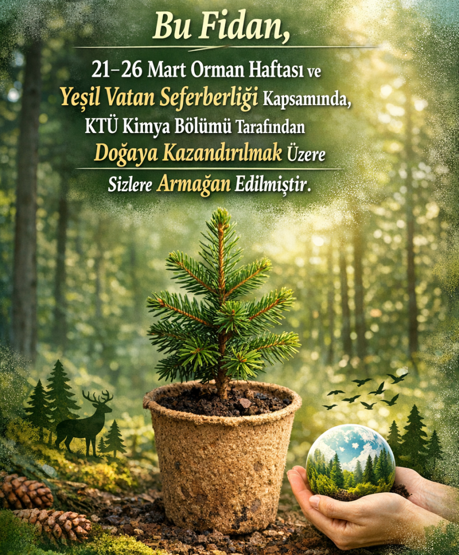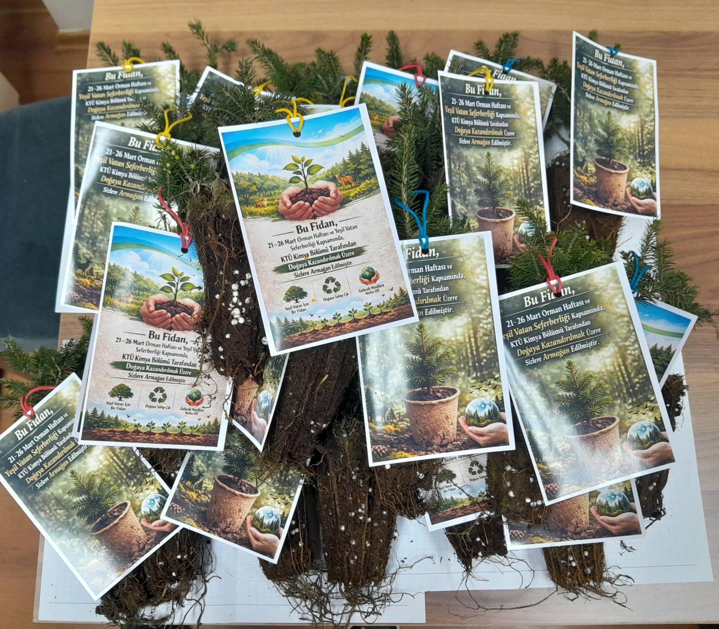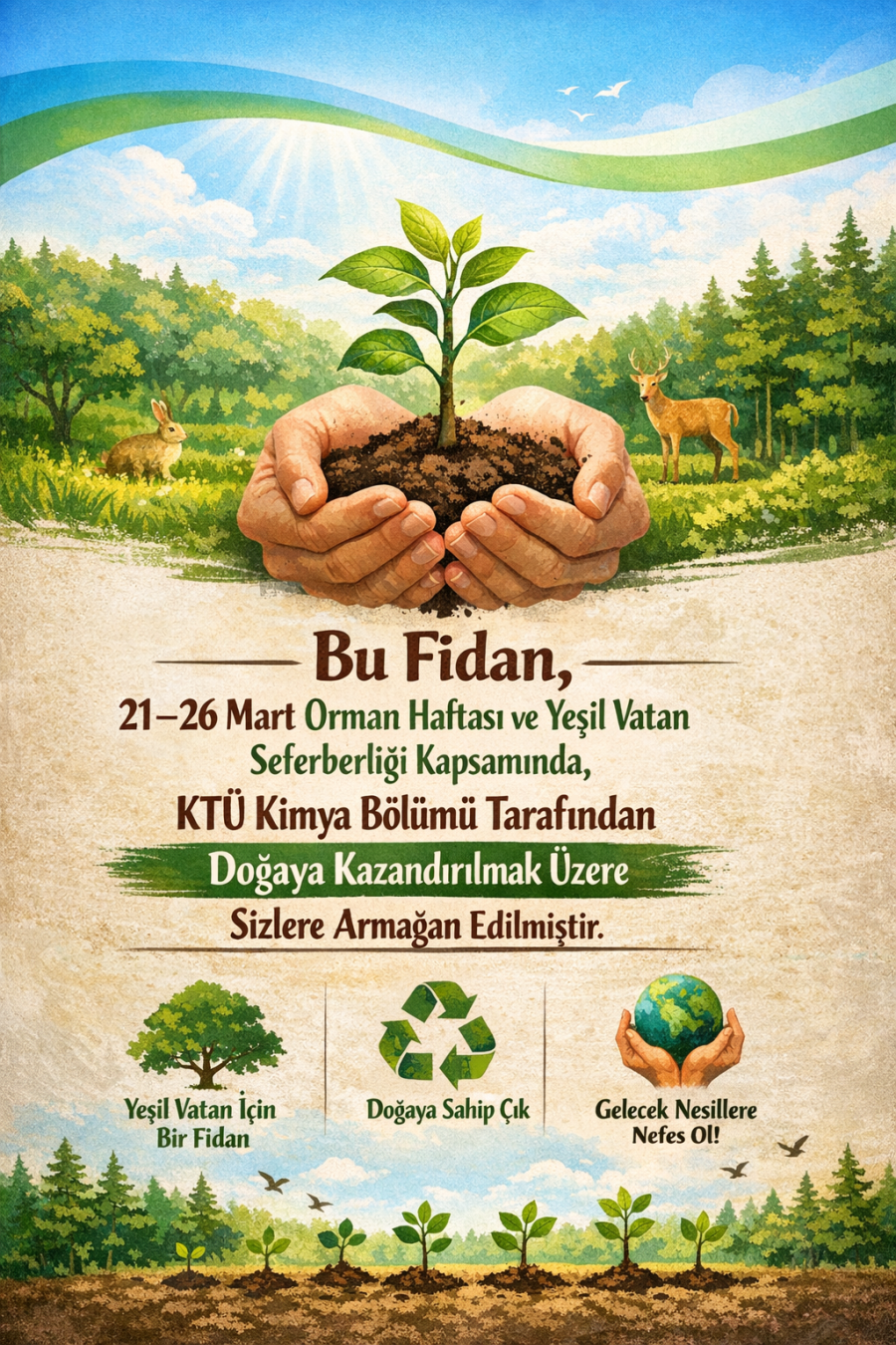 "Sürdürülebilir kalkınma hedeflerine yönelik yıl içerisinde düzenlenen etkinlik sayısı (Sürdürülebilir Şehirler ve Topluluklar)" kapsamında KTÜ Kimya Bölüm Başkanlığı olarak, 21–26 Mart Orman Haftası ve Yeşil Vatan Seferberliği dolayısıyla anlamlı bir etkinlik gerçekleştirdik. 06.04.2026 Tarihinde saat 10:00'da Bölümümüz akademik ve idari personeline Ladin fidanları dağıttık. Doğaya katkı sağlamak ve çevre bilincini artırmak amacıyla düzenlenen bu etkinlikte, fidanlar toprakla buluşturulacağı ve geleceğe nefes olacak bir adım atıldı. Organizasyonda, doğanın korunmasının önemi vurgulanırken, sürdürülebilir bir çevre için bireysel sorumlulukların altı çizildi. Etkinlik kapsamında dağıtılan fidanlarla hem çevresel farkındalık oluşturulması hem de yeşil alanların artırılmasına katkı sağlanması amaçlandı