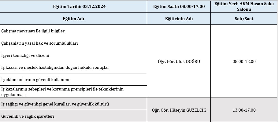İSG Temel Eğitimi 2-3 Aralık 2024 tarihinde AKM Hasan SAKA Salonunda gerçekleştirilecektir.