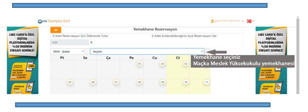 Sevgili Öğrenciler, 26.02.2024 tarihinden itibaren Maçka Meslek Yüksekokulu bünyesinde yemekhane hizmeti başlayacaktır. Yemekhaneden faydalanabilmek için bir önceki haftanın Cuma Günü saat 13:00'a kadar rezervasyon yapılması gerekmektedir. Aşağıda verilen modülde anlatılan adımları takip ederek kampuskart.ktu.edu.tr adresinden kaydınızı yapmanız ve dilediğiniz günler için yemek rezervasyonunu yaptırmanız durumunda 26.02.2024 tarihinden itibaren yemekhane hizmetini kullanmaya başlayabilirsiniz. Bir günlük yemek ücreti 20.90 TL olup Meslek Yüksekokulu binası yan tarafındaki ek binada hizmet verilecektir. Kredi kartı olmayan öğrenciler kampüs kart hesaplarına bakiye yükleyerek ödeme yapabileceklerdir.