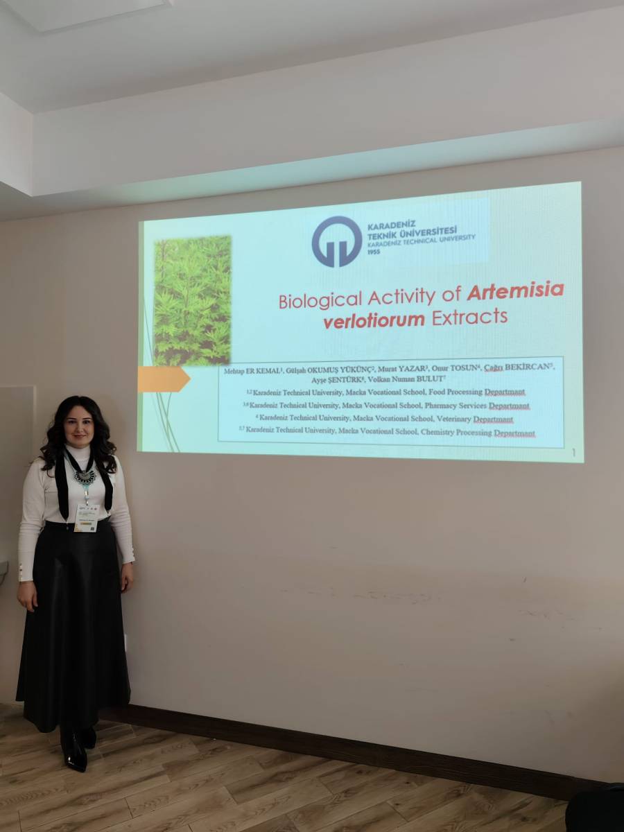 Karadeniz Teknik Üniversitesi (KTÜ) Bilimsel Araştırma Projeleri Koordinatörlüğü'nün (BAP) desteğiyle yürütülmüş FAY-2024-11209 nolu altyapı projesinin bazı sonuçları, Maçka MYO Gıda İşleme Bölümü Öğr. Gör. Dr. Mehtap Er Kemal tarafından kongrede sözlü olarak paylaşıldı.Gıda İşleme Bölümü öğretim elemanı Öğr. Gör. Dr. Mehtap Er Kemal, projenin ilk aşama sonuçlarını, "Biological activity of Artemisia verlotiorum extracts" başlıklı bildirisiyle, 21–23 Kasım 2025 tarihleri arasında Azerbaycan Bakü'de gerçekleştirilen III. International Apitherapy and Nature Kongresi'nde sözlü bildiri ile sundu.
