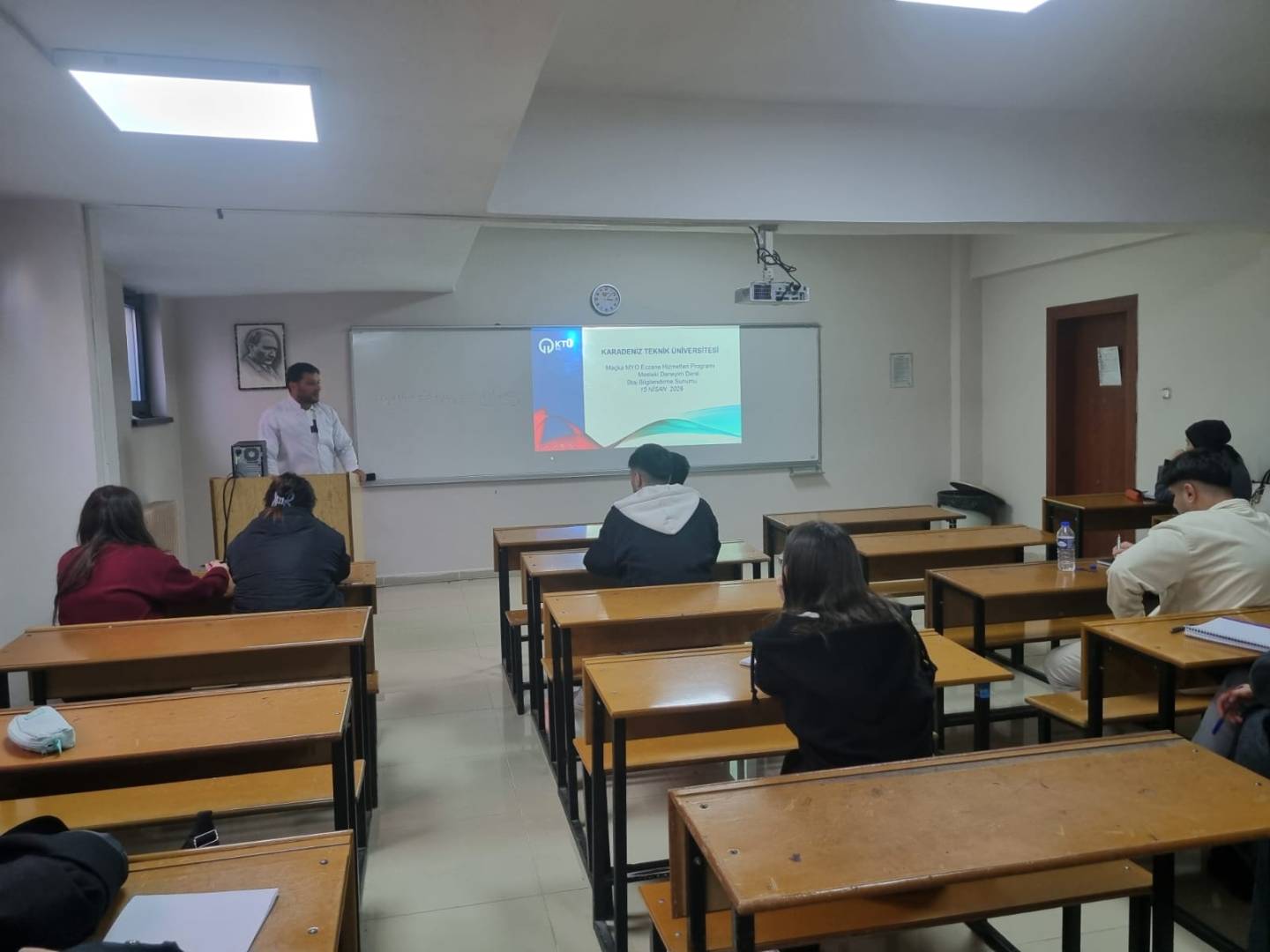 Eczane Hizmetleri Bölümü, Eczane Hizmetleri Programı Öğrencilerine yönelik olarak Öğr. Gör. Murat YAZAR tarafından 16 Nisan 2026 tarihinde Staj Bilgilendirme Sunumu gerçekleştirilmiştir. Staj süreci, Staj Yönetim Sistemi, Staj süreci ve Staj sonlandırılma işlemlerinin anlatıldığı sunumda öğrencilerin staj evraklarını hazırlama ve sisteme yükleme ile ilgili karşılaşılabilecekleri sorunlar ve hatalar ve ilgili soruları cevaplanarak sağlıklı bir staj sürecinin tamamlanması üzerine bilgi alışverişinde bulunuldu.