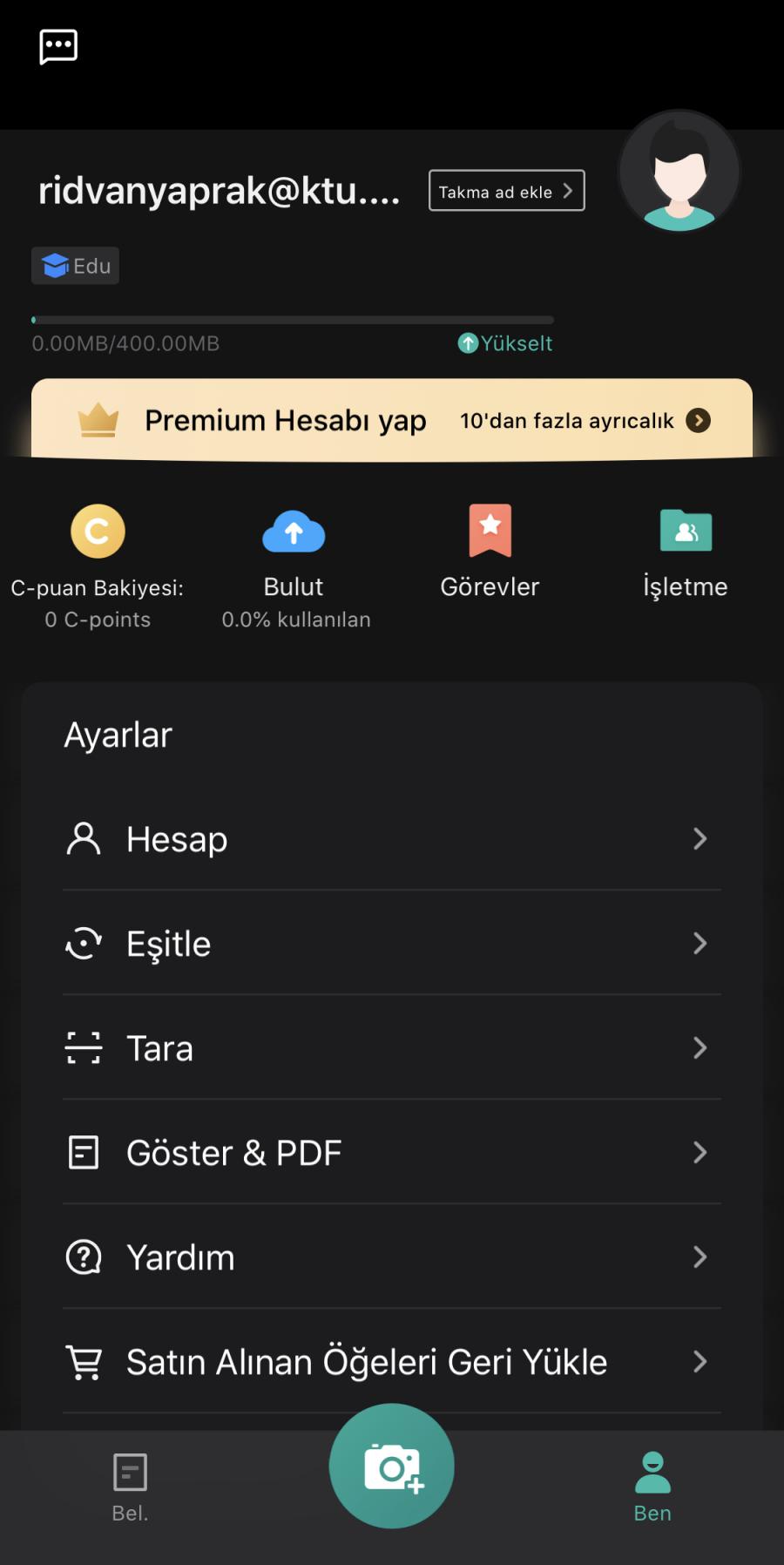 Not 1: ktu.edu.tr uzantılı e-posta adresinizle kayıt olmanız Premium Hesap ayrıcalıklarını ücretsiz olarak sunmaktadır. Standart hesapla yapılan taramalarda belge üzerinde CamScanner filigranı kalmaktadır.