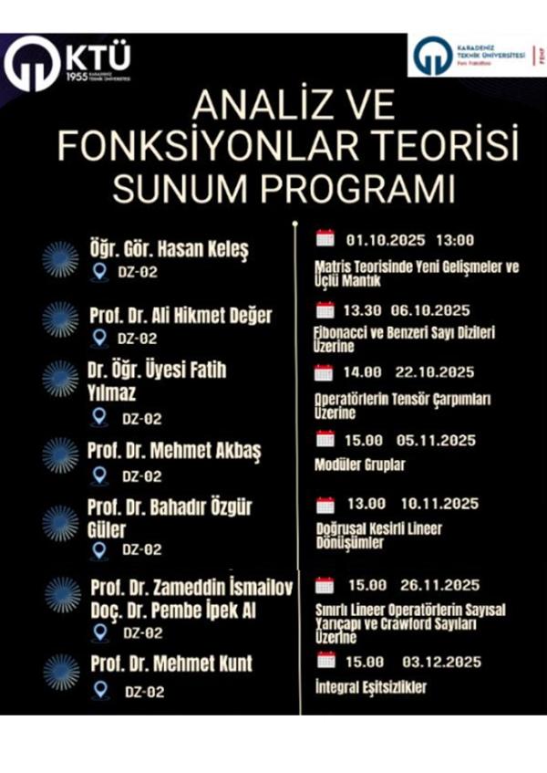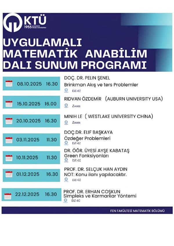 Bilginin topluma yayılması amacı ile düzenlenen faaliyetler kapsamında Matematik Bölümü olarak, lisans öğrencilerimizin matematiğin farklı alt alanlarını daha yakından tanımalarını sağlamak ve lisansüstü öğrencilerimizin ilgi duydukları konularda derinleşmelerine katkı sağlamak amacı ile Bölüm İçi Seminer Programı düzenlemekteyiz.