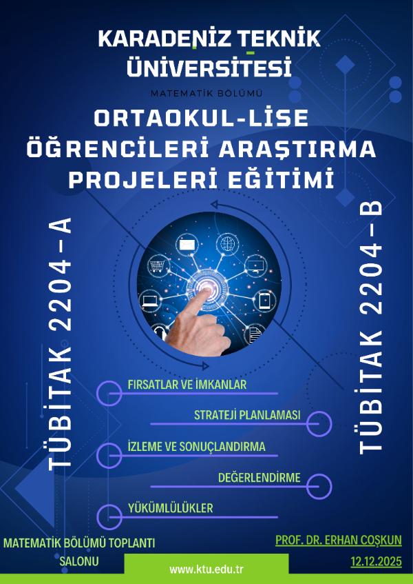 Bölümümüz tarafından, TÜBİTAK 2204-B Ortaokul Öğrencileri ve ayrıca TÜBİTAK 2204-A Lise Öğrencileri Araştırma Projeleri Programı kapsamında, ortaokul-lise öğrencileri ve danışman öğretmenlerine yönelik bilgilendirici bir seminer düzenlenecektir. Seminer, 12.12.2025 tarihinde saat 10.00 'da Fen Fakültesi Matematik Bölümü Toplantı Salonunda gerçekleştirilecek olup programın sunduğu fırsatlar, proje hazırlama stratejileri, araştırma planlama süreçleri ve örnek başarılı projeler üzerine kapsamlı bir içerik sunacaktır.