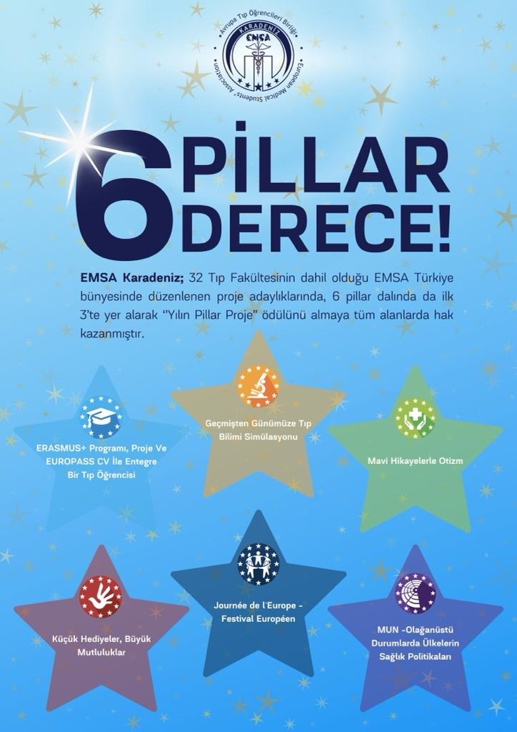 EMSA Karadeniz ekibi, başarılar ile döneme devam ediyor. EMSA'nın 6 farklı çalışma alanında 32 Fakülte arasından Türkiye'deki en iyi ilk 3 projeden birini çıkaran ekip, 6 alanda da yılın pillar projesi ödülü için aday olmuştur. Tüm ekibi tebrik eder, başarılarının devamını dileriz. |