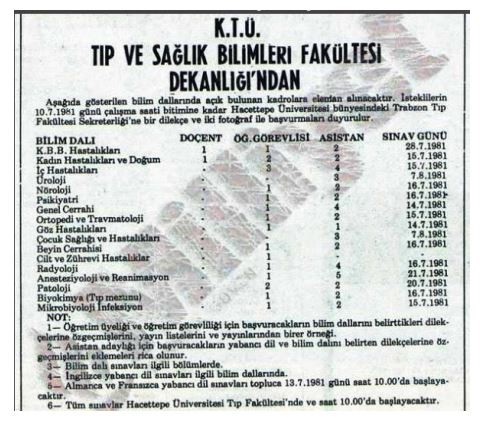 O yıllarda KTÜ Tıp ve Sağlık Bilimleri Fakültesi kapsamında hizmet veren Dahili, Cerrahi ve Temel Tıp Bilimleri bölümleri altında bulunan tıbbi branşlar bilim dalı olarak yapılandırılmıştı. Bilim dallarının hoca ve asistan eksiğinin henüz giderilememesi nedeniyle 1981 yılı Ocak ve Haziran aylarında yeniden ilanlar yapılmıştır (o günkü ilanlarda dahi başvuru adresi olarak Hacettepe Üniversitesi Trabzon Tıp Fakültesi İrtibat Bürosu belirtilmiştir) (Resim 6).