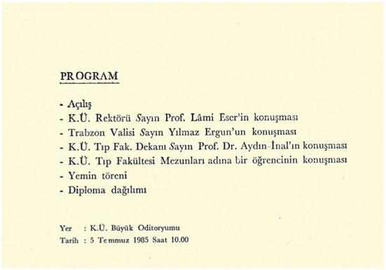 Bu arada KTÜ Tıp Fakültesi 1982-1983 eğitim-öğretim yılında kendi bünyesine aldığı öğrencilerin eğitimlerini 1988 yılı itibariyle tamamlayarak ilk mezunlarını verir. Ancak daha öncesinde de Hacettepe’den aktarılan ara sınıfların mezuniyet törenleri peyder pey yapılmıştır (Resim 9-10).