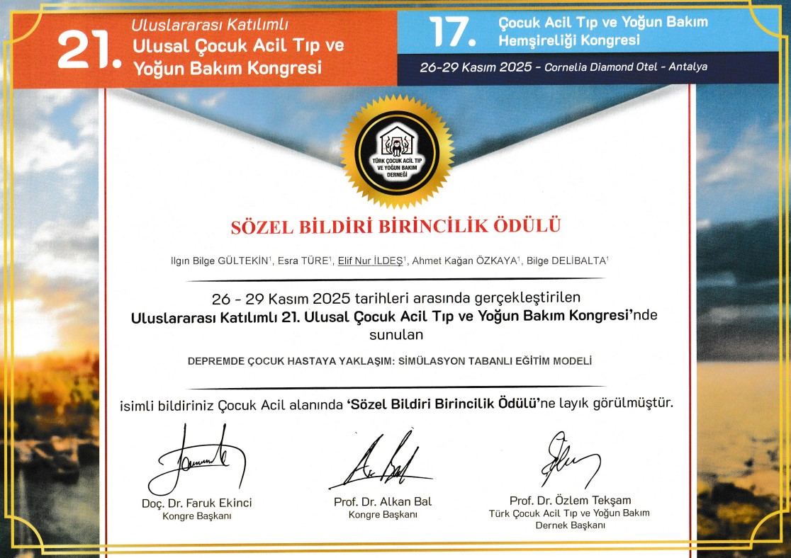 26 – 29 Kasım 2025 tarihleri arasında gerçekleştirilen Uluslararası Katılımlı 21. Ulusal Çocuk Acil Tıp ve Yoğun Bakım Kongresi kapsamında sözlü bildiri olarak sunulan çalışma, jüri değerlendirmesi sonucunda Sözel Bildiri Birincilik Ödülü kazanarak ulusal düzeyde önemli bir bilimsel başarıya imza attı.