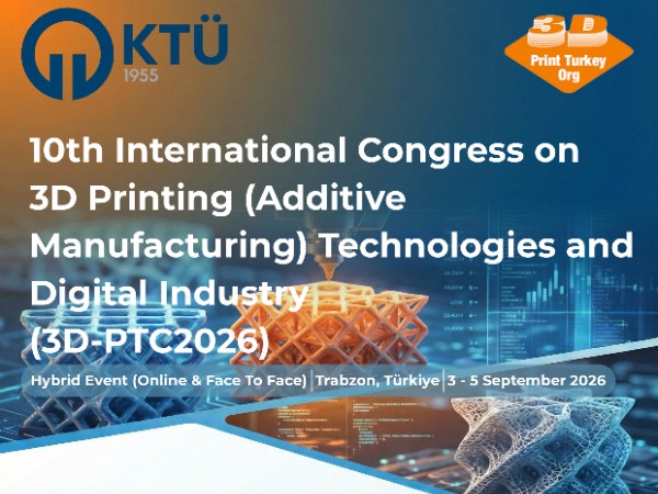 KTÜ ev sahipliğinde düzenlenen 10. Uluslararası 3D Baskı (Eklemeli İmalat) Teknolojileri ve Dijital Endüstri Kongresi (3D-PTC2026), 3-5 Eylül 2026 tarihleri arasında Trabzon'da.