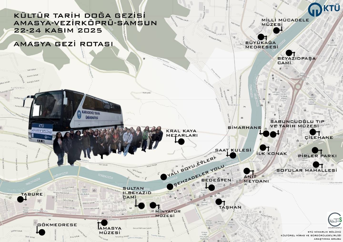 Bölümümüz bünyesinde yer alan CulTage_S - Kültürel Miras ve Sürdürülebilirliği Araştırma Grubu faaliyetleri kapsamında 2025-2026 Güz Yarıyılı 22-24 Kasım 2025 tarihleri arasında Vezirköprü-Amasya-Samsun kentlerini içeren bir teknik gezi düzenlenmiştir. Kültür-Tarih-Doğa Deneyimi odaklı teknik gezi ile kentlerin doğal ve kültürel mirasının, geleneksel sokak dokularının, tarihi ve anıtsal yapılarının, zanaat ve geleneksel sanatlarının ve bunların sergilendiği müzelerin yerinde gezilip görülmesi ve fotoğraflarla belgelenmesi amaçlanmıştır. Bölümümüz öğretim üyeleri Prof. Dr. Derya ELMALI ŞEN, Prof. Dr. Reyhan MİDİLLİ SARI, Prof. Dr. Nihan CANBAKAL ATAOĞLU, Doç. Dr. Özlem AYDIN ve Öğr. Gör. Dr. Kıymet SANCAR ÖZYAVUZ tarafından yönetilen teknik gezi; 2., 3. ve 4. sınıftan 25 öğrencinin katılımıyla anılan kentlerin doğal ve kültürel varlıklarını kapsayan yoğun bir program eşliğinde gerçekleştirilmiştir. Mimarlık öğrencilerinin mimarlığın özünde yer alan somut ve somut olmayan kültürel varlıklarını bizzat yaşayarak deneyimlemesi aracılığıyla hem kalıcı öğrenme desteklenmiş hem de kültürel değerlere yönelik farkındalık oluşumuna katkı sağlanmıştır.