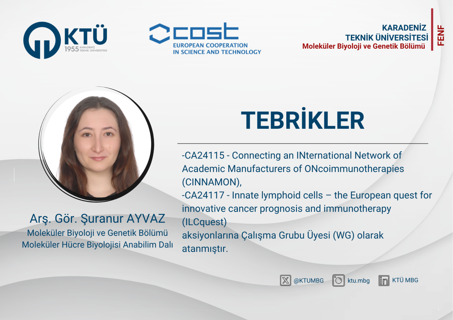 Bölümümüz öğretim elemanlarından Arş. Gör. Şuranur AYVAZ 'CA24115 - Connecting an INternational Network of Academic Manufacturers of ONcoimmunotherapies (CINNAMON), CA24117 - Innate lymphoid cells – the European quest for innovative cancer prognosis and immunotherapy (ILCquest)' aksiyonlarına Çalışma Grubu Üyesi (WG) olarak atanmıştır.