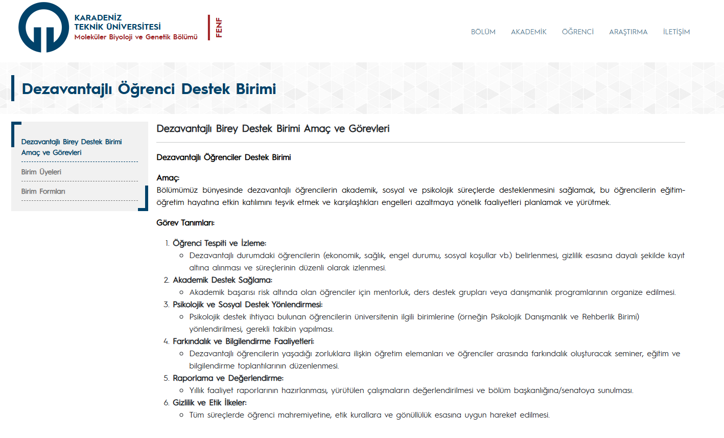 Bölümümüz bünyesinde dezavantajlı öğrencilerin akademik, sosyal ve psikolojik süreçlerde desteklenmesini sağlamak, bu öğrencilerin eğitim-öğretim hayatına etkin katılımını teşvik etmek ve karşılaştıkları engelleri azaltmaya yönelik faaliyetleri planlanması ve yürütülmesi amacıyla Dezavantajlı Öğrenci Destek Birimi kurulmuştur.