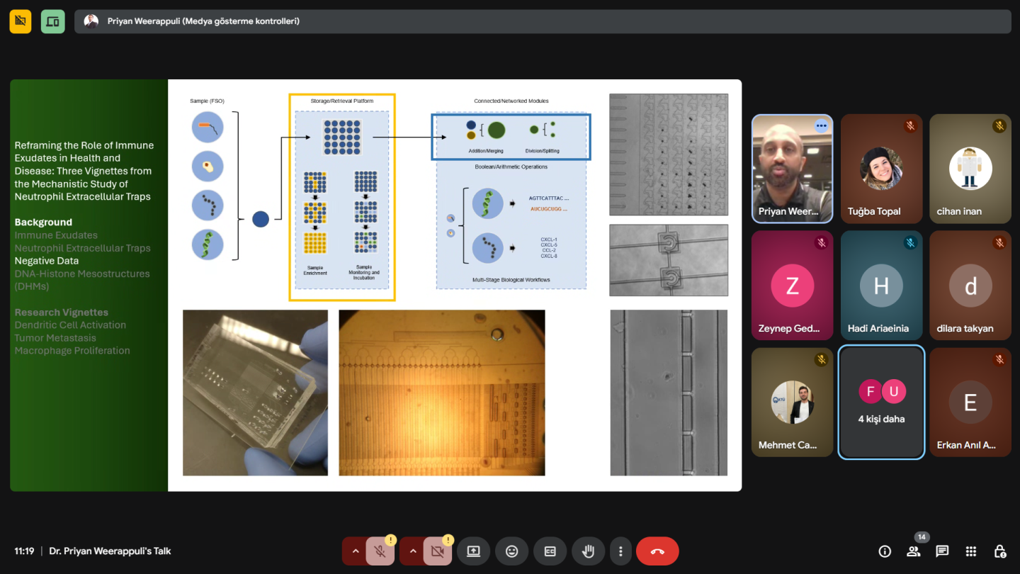 “Reframing the Role of Immune Exudates in Health and Disease: Three Vignettes from the Mechanistic Study of Neutrophil Extracellular Traps” başlıklı sunumunda Dr. Weerappuli, nötrofil ekstrasellüler tuzaklarının (NETs) sağlık ve hastalık süreçlerindeki mekanistik rollerini ayrıntılı biçimde ele aldı. Bağışıklık sistemi hücrelerinin bu özel savunma mekanizmasının enfeksiyon, inflamasyon ve otoimmün hastalıklarla ilişkisini açıklayan konuşma, katılımcılardan yoğun ilgi gördü.