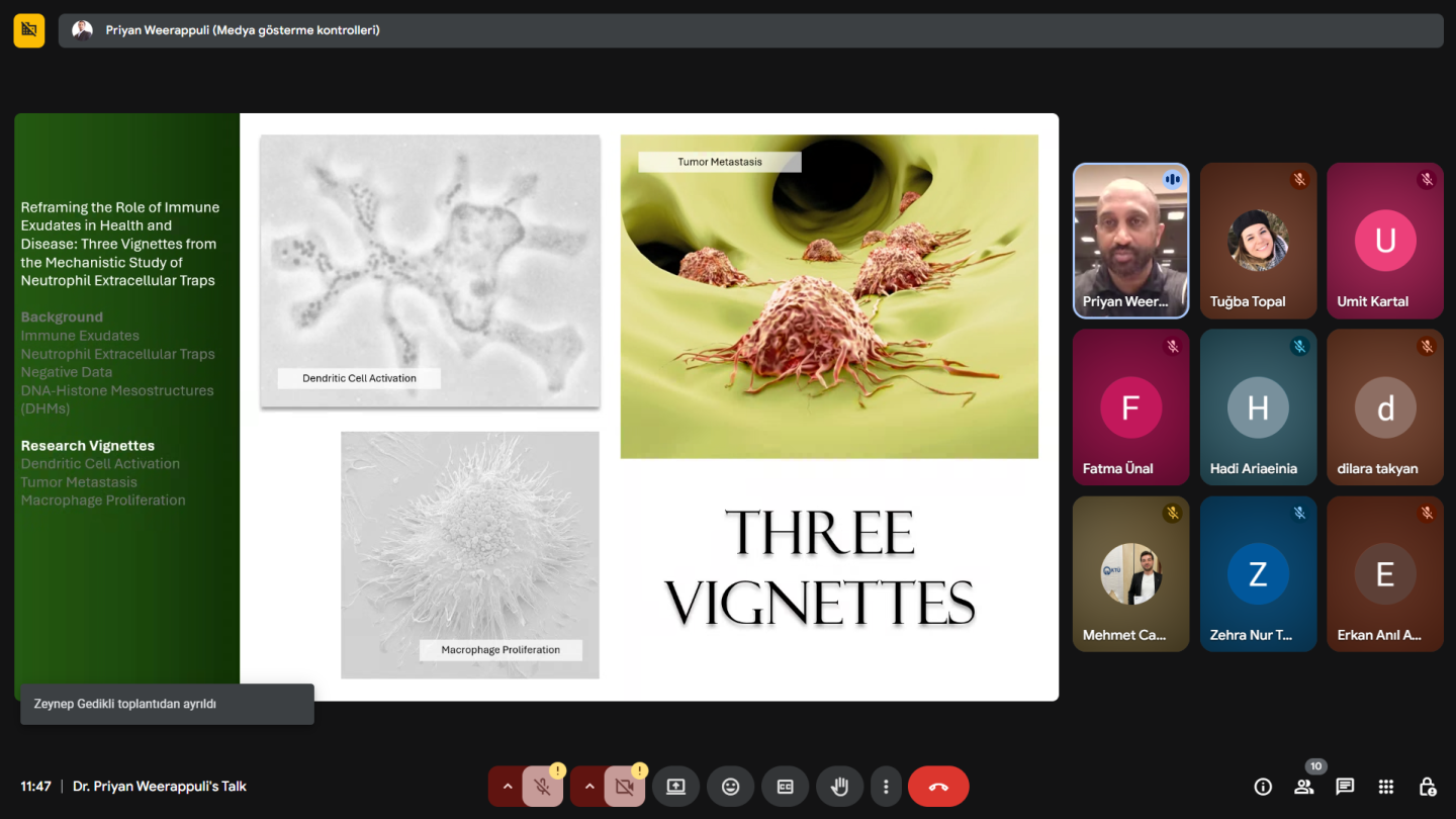 “Reframing the Role of Immune Exudates in Health and Disease: Three Vignettes from the Mechanistic Study of Neutrophil Extracellular Traps” başlıklı sunumunda Dr. Weerappuli, nötrofil ekstrasellüler tuzaklarının (NETs) sağlık ve hastalık süreçlerindeki mekanistik rollerini ayrıntılı biçimde ele aldı. Bağışıklık sistemi hücrelerinin bu özel savunma mekanizmasının enfeksiyon, inflamasyon ve otoimmün hastalıklarla ilişkisini açıklayan konuşma, katılımcılardan yoğun ilgi gördü.