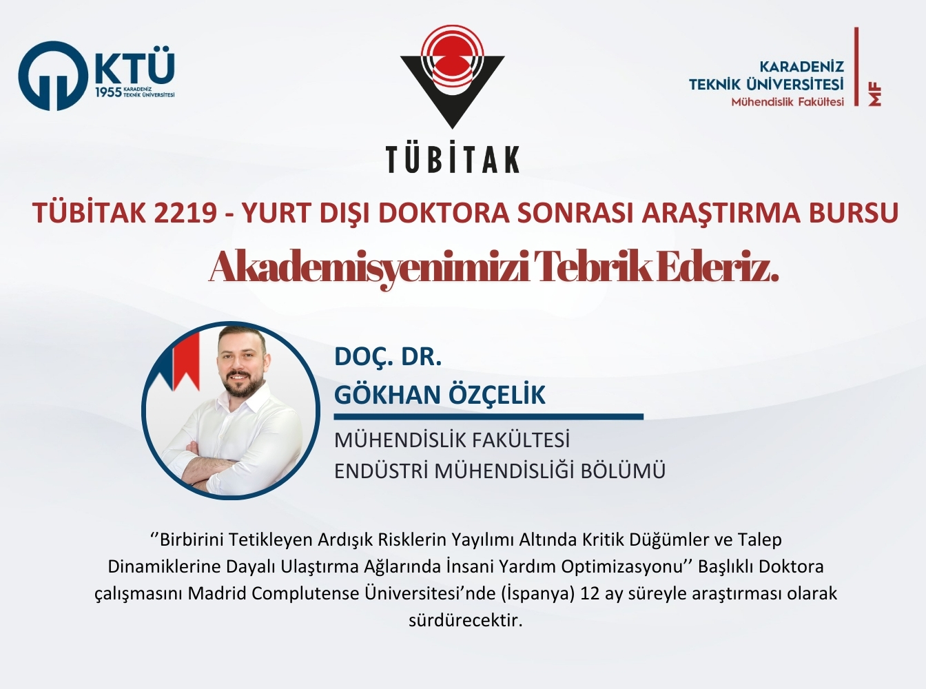 Fakültemiz Endüstri Mühendisliği Bölümü Öğretim Üyesi Doç. Dr. Gökhan ÖZÇELİK, TÜBİTAK 2219 - Yurt Dışı Doktora Sonrası Araştırma Bursu almaya hak kazanmıştır. Doç. Dr. Gökhan ÖZÇELİK, doktora çalışmaları kapsamında yürüttüğü “Birbirini Tetikleyen Ardışık Risklerin Yayılımı Altında Kritik Düğümler ve Talep Dinamiklerine Dayalı Ulaştırma Ağlarında İnsani Yardım Optimizasyonu” başlıklı araştırmasını, İspanya’da bulunan Madrid Complutense Üniversitesi’nde 12 ay süreyle sürdürecektir.