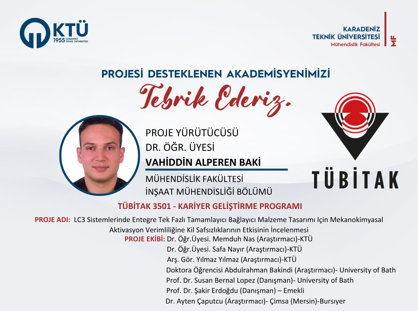 Fakültemiz İnşaat Mühendisliği Bölümü öğretim üyelerinden Dr. Öğr. Üyesi Vahiddin Alperen BAKİ'nin “LC3 Sistemlerinde Entegre Tek Fazlı Tamamlayıcı Bağlayıcı Malzeme Tasarımı Için Mekanokimyasal Aktivasyon Verimliliğine Kil Safsızlıklarının Etkisinin İncelenmesi” başlıklı projesi, “TÜBİTAK 3501-Kariyer Geliştirme Programı” kapsamında desteklenmiştir.