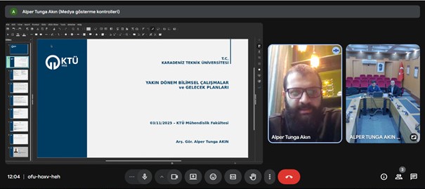 "Akademik Performans ve Hedefler" sunumları kapsamında Fakültemiz Harita Mühendisliği Bölümü Kartografya Anabilim Dalı Araştırma Görevlisi Alper Tunga AKIN ile 03.11.2025 tarihinde çevrim içi bir görüşme gerçekleştirilmiştir. Görüşme kapsamında Arş. Gör. AKIN bir sunum gerçekleştirmiştir.
