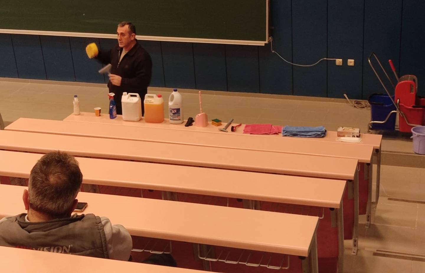 Daha sonra personellerimizden Yaşar KÜNEY uygulamalı bir şekilde temizlik malzemelerinin sınıflandırılması, tanımlanması, uygulanması/kullanımı ve depolanması gibi konularda pratik uygulamalar yaptı. Her uygulama sonrasında diğer temizlik personellerimiz uygulamalarla ilgili etkileşimde bulunarak en etkili uygulama örnekleri tartışıldı.