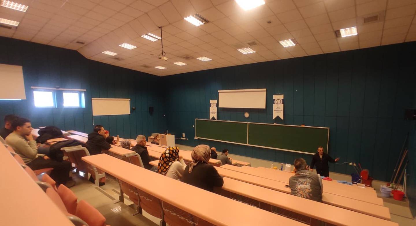 Mühendislik Fakültesi fiziki alanları, çevre, ortak alanlar, bina girişleri, koridorlar, laboratuvarlar, derslikler, PVC yüzeyler, lavabolar, tuvaletler, camlar, vb. için temizlik faaliyetleri ile ilgili bir oryantasyon etkinliği düzenlendi (18.03.2026). Etkinliğe fakültemiz bünyesindeki temizlik personellerimiz katıldı.