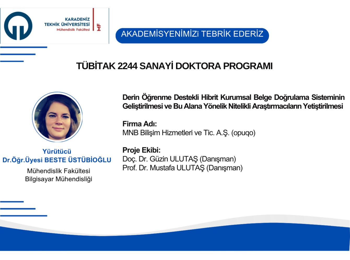 Üniversitemiz Mühendislik Fakültesi Bilgisayar Mühendisliği Bölümü öğretim üyelerinden Dr. Öğr. Üyesi Beste ÜSTÜBİOĞLU 'nun "Derin Öğrenme Destekli Hibrit Kurumsal Belge Doğrulama Sisteminin Geliştirilmesi ve Bu Alana Yönelik Nitelikli Araştırmacıların Yetiştirilmesi" başlıklı projesi TÜBİTAK 2244 Sanayi Doktora Programı tarafından desteklenmiştir. Akademisyenimizi ve proje ekibini tebrik eder, başarılarının devamını dileriz.