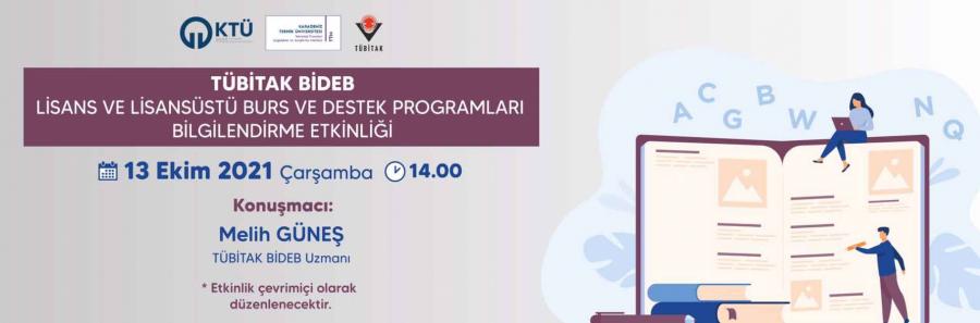 Üniversitemiz lisans ve lisansüstü öğrencilerine yönelik TÜBİTAK BİDEB Burs programları ile ilgili TÜBİTAK BİDEB Uzmanı Melih GÜNEŞ’in konuşmacı olarak katılacağı 13 Ekim 2021 Çarşamba saat 14.00’da çevrimiçi bilgilendirme etklinliği düzenlenecektir.