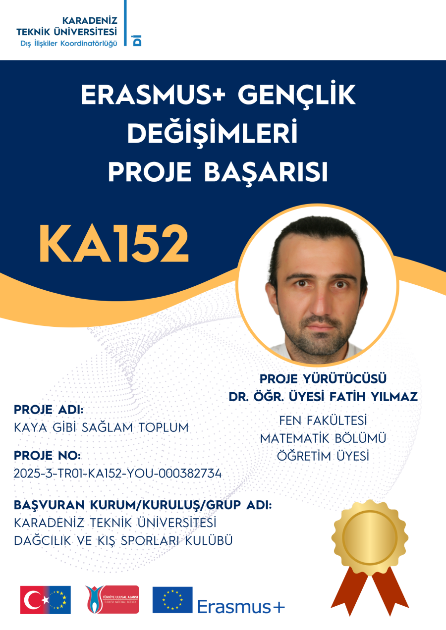 Proje yürütücülüğünü Dr. Öğr. Üyesi Fatih YILMAZ'ın üstlendiği "Kaya Gibi Sağlam Toplum" adlı Erasmus+ Gençlik Projesi, Ulusal Ajans tarafından hibelendirilmeye hak kazandı. Öğretim üyemizi tebrik eder, başarılarının devamını dileriz. KTÜ Dağcılık ve Kış Sporları Kulübü'ne ve KTÜ Değişim Programları Koordinatörlüğü ekibinden Öğr. Gör. Zehra ŞAHİN BEKTAŞ'a katkılarından dolayı teşekkür ederiz.