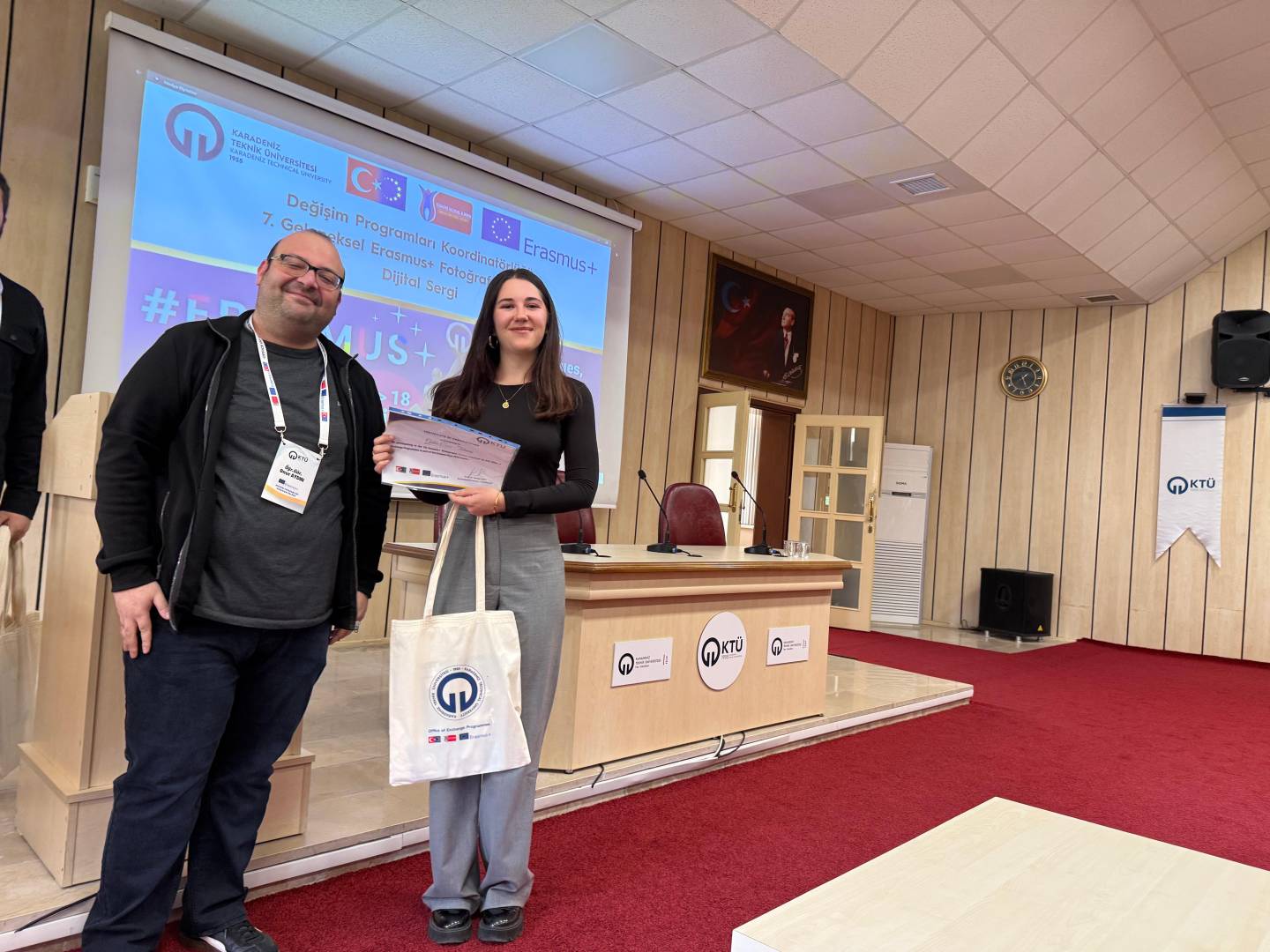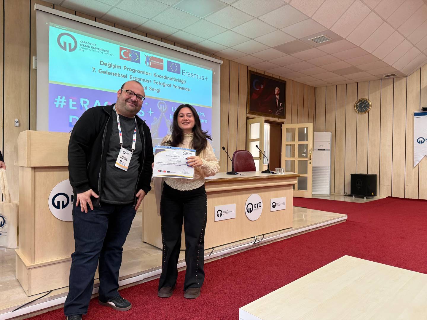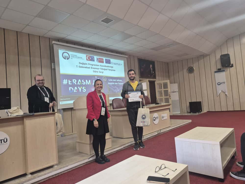 Bu yıl da hem dünyanın farklı ülkelerindeki hem de ülkemizdeki diğer üniversiteler ile eş zamanlı olarak, Üniversitemiz Değişim Programları Koordinatörlüğü’nün organizasyonuyla KTÜ Erasmus Günleri 2025 etkinlikleri 13-14-15 Ekim 2025 tarihlerinde düzenlendi. Etkinlikler kapsamında ayrıca 7. Geleneksel Erasmus+ Fotoğraf Yarışması düzenlendi. Yarışmada daha önce Erasmus+ programından faydalanmış öğrencilerin fotoğrafları yarıştı. Etkinliğin birinci gününde yarışmaya katılım sağlayan öğrencilerin fotoğrafları dijital sergi olarak Koordinatörlüğümüzün sosyal medya hesaplarında paylaşıldı. Etkinliğin ikinci gününde oylama sonucu ilk üçe giren fotoğrafların sahibi öğrencilerimiz için Fen Fakültesi Nazım Terzioğlu Amfisi'nde ödül töreni düzenlendi. Dereceye giren öğrencilerimize hediyeleri Dış İlişkiler Genel Koordinatörü Prof. Dr. Sercan EROL ve Değişim Programları Koordinatörlüğü ekibi tarafından takdim edildi. Ödül töreninin ardından Değişim Programları Koordinatörlüğü tarafından Erasmus+ Öğrenci Öğrenim ve Staj Hareketliliği programları hakkında bilgilendirme toplantısı düzenlendi. Etkinliğin son gününde daha önce Erasmus+ programından faydalanmış öğrencilerimiz deneyimlerini anlatan sunumlar gerçekleştirdiler ve Erasmus Student Network'ün KTÜ'deki temsilcisi olan ESN Trabzon tarafından ESN öğrenci topluluğunu tanıtan bir sunum gerçekleştirildi. Etkinliklere ve fotoğraf yarışmasına katılan tüm öğrencilerimize teşekkür ederiz.