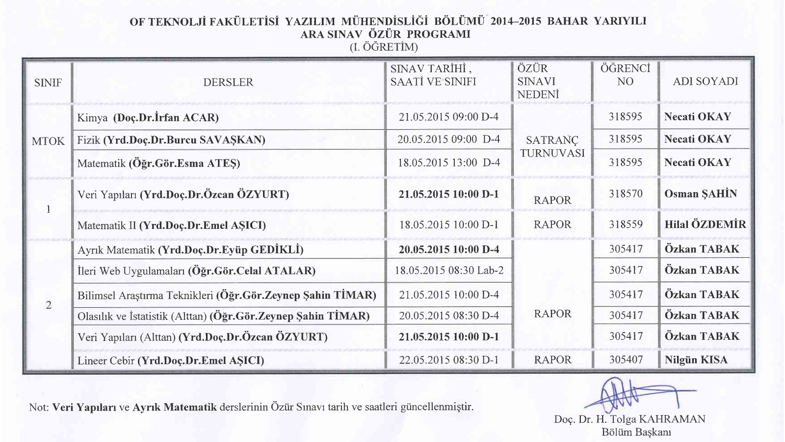 Düzeltildi! Özür Sınavı Programı ve Girecek Öğrencilerimizin Listesi