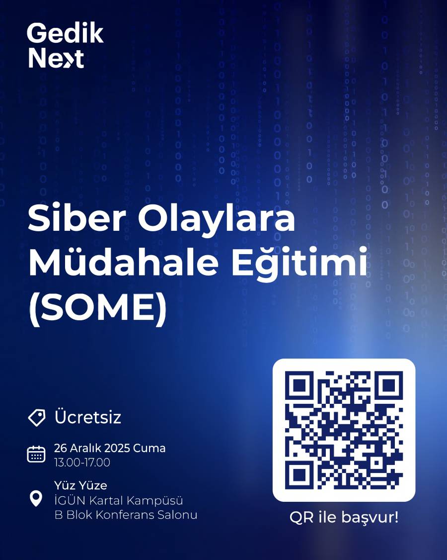 13 Şubat 2026 tarihinde 13:00-17:00 saatleri arasında yüz yüze gerçekleştirilecek eğitimde, katılımcıların güncel siber saldırı türlerini tanıması, olay müdahale süreçlerine ilişkin temel adımlarıöğrenmesi ve kurum içi ile kurumlar arası iş birliğinin güçlendirilmesi hedeflenmektedir. Ayrıca eğitim, Gedik NEXT çatısı altında yeni iş birliklerinin gelişmesine olanak sağlayacak networking ortamı da sunacaktır. Eğitime katılım ücretsiz olup kontenjan sınırlıdır. Katılım başvuru formuna https://forms.office.com/r/RbpJDaXWFb adresi üzerinden erişim sağlanabilmektedir.