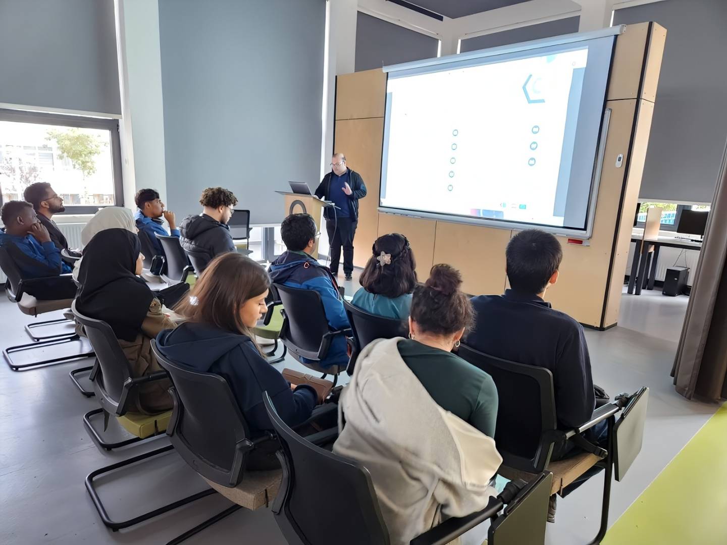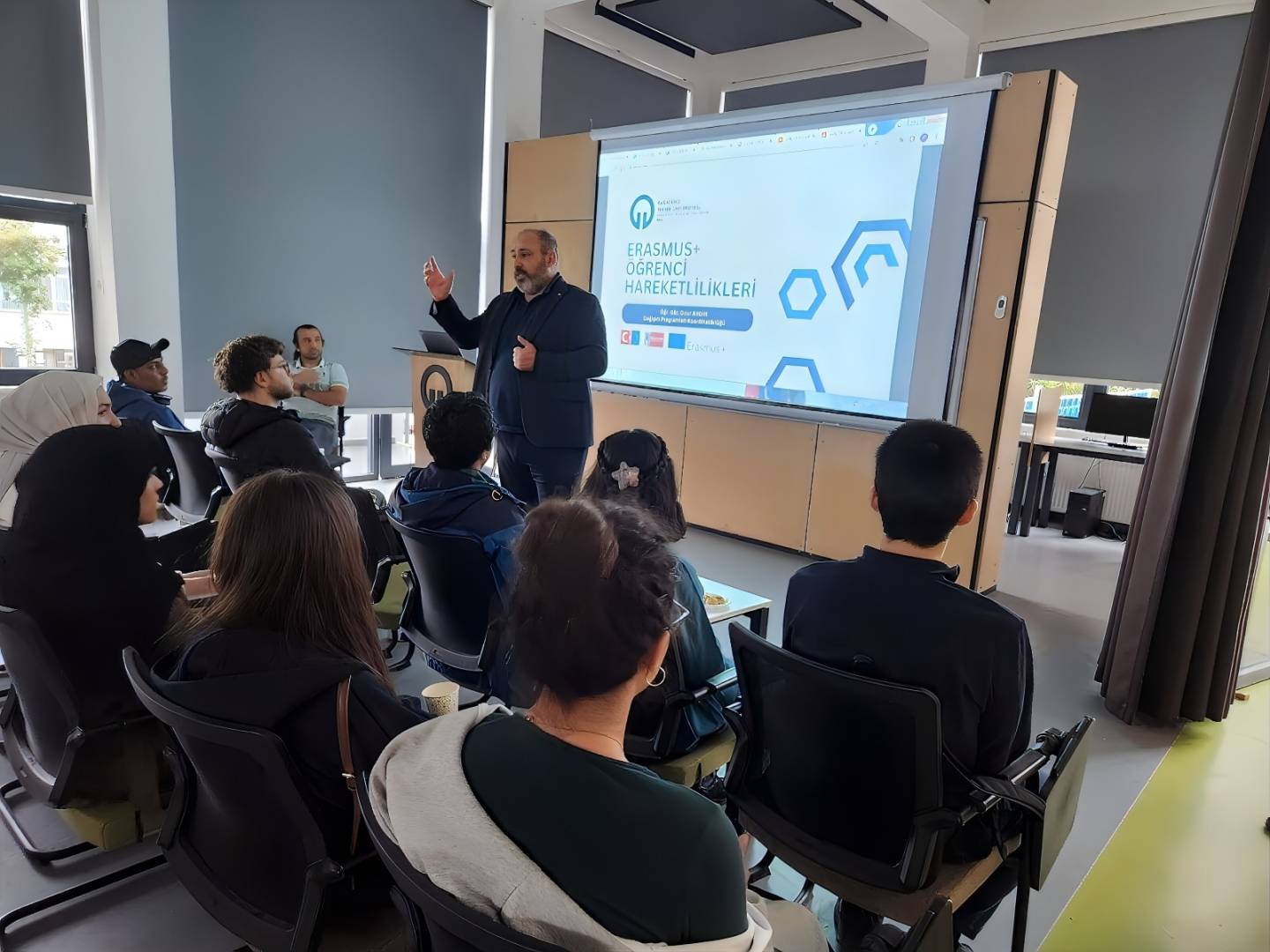 During the meeting, students were informed about the general introduction of our university, the organizational structure of the Office of International Relations, the activities of the Office of International Students, and the Erasmus+ program. Presentations were delivered by the Vice Coordinator of the Office of International Student Affairs, Dr. Fatih YILMAZ, and Lecturer Onur AYDIN, while introductory speeches were made by Coordinator of the Office of International Relations Prof. Dr. Sercan EROL and Coordinator of the Office of International Student Affairs Assoc. Prof. Dr. Tane VERGİLİ.