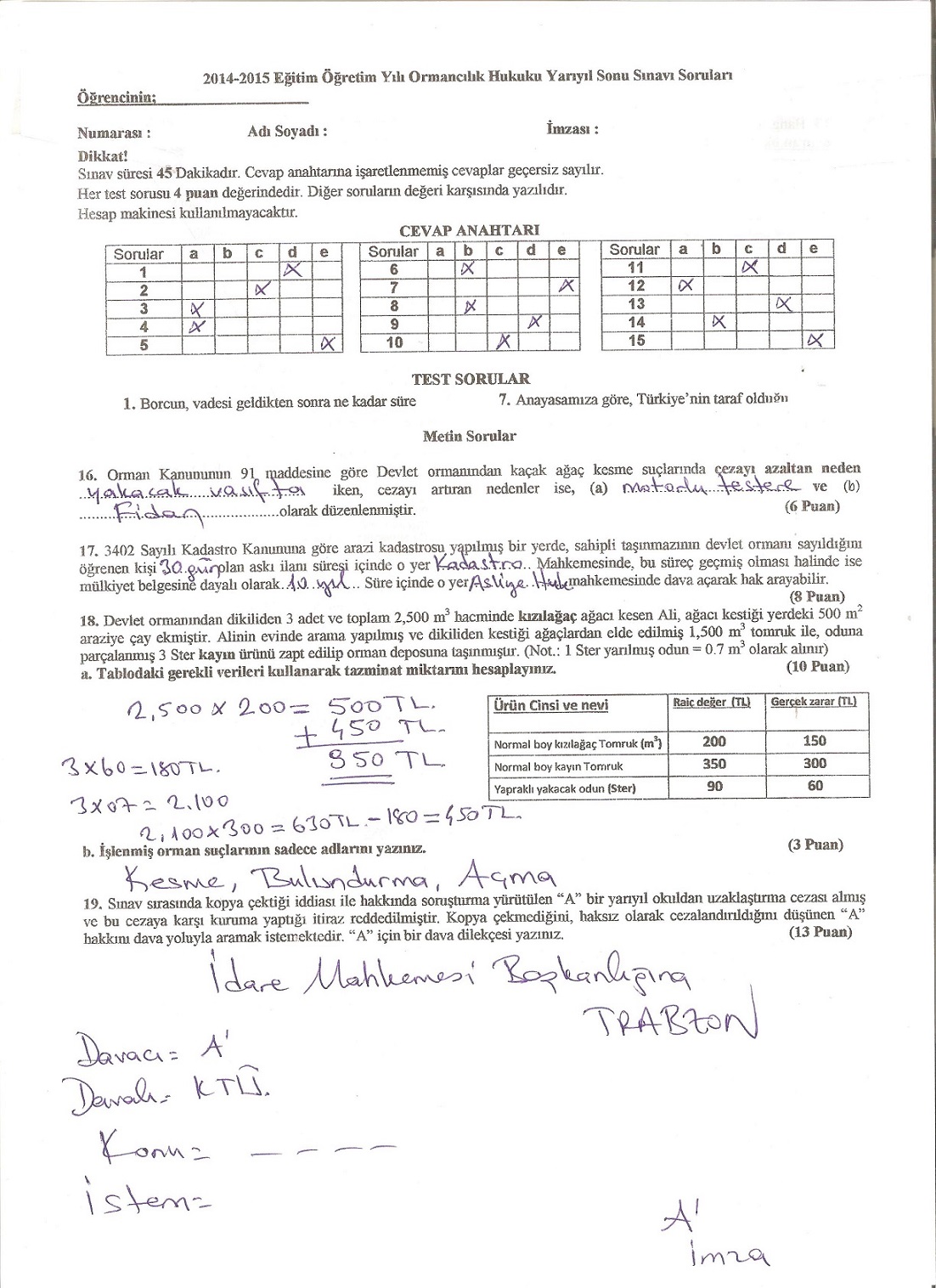 Ormancılık Hukuku Dersi Dönem Sonu Sınav Cevap Anahtarı