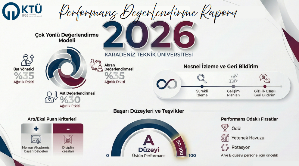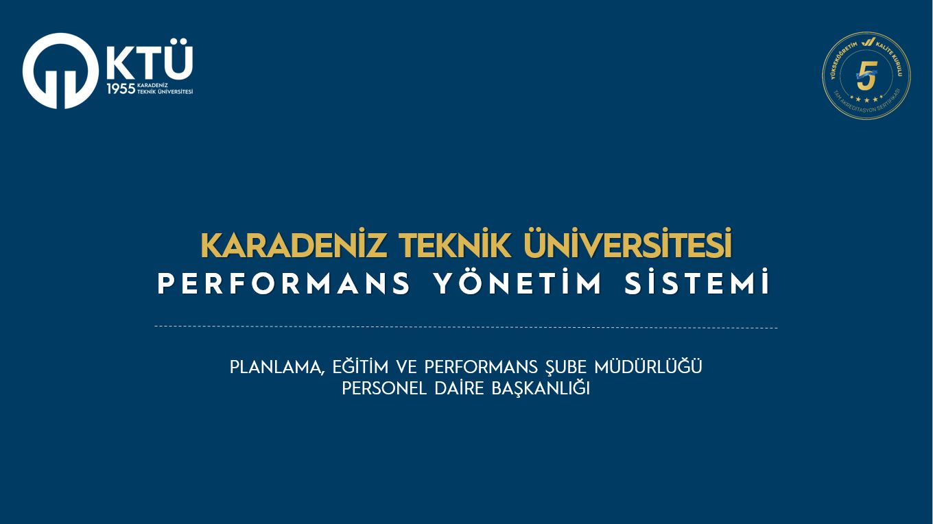 KTÜ Performans Yönetim Sistemi 360 Derece Geri Bildirim Yaklaşımı esas alınarak Genel Sekreterlik koodinasyonunda iç ve dış paydaşların katılımı ile profesyonel çalışma ekibi tarafından kamu ve yükseköğretim kurumlarına özel olarak geliştirilen yenilikçi bir performans yönetim sistemidir. KTÜ Performans Yönetim Sistemi aracılığıyla hem yönetici hem de personel fiilen birlikte çalıştığı üst, akran ve astları tarafından değerlendirilerek performans puanı elektronik ortamda hesaplanmaktadır.