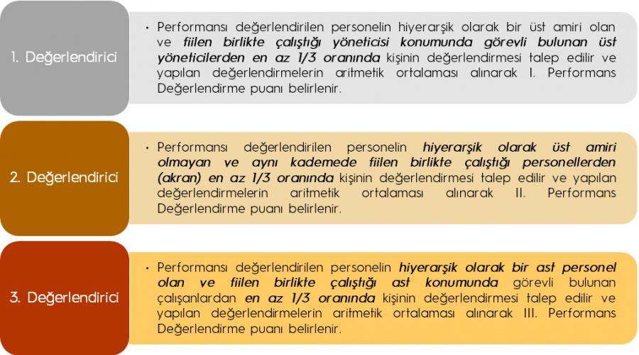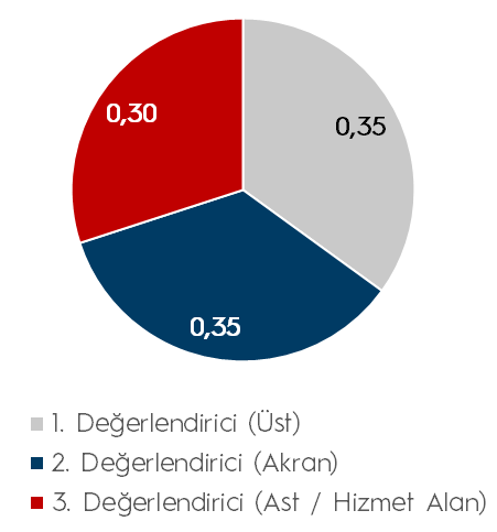 Performans değerlendirmesi; değerlendiricilerden kaynaklı hataları en alt düzeye indirmek amacıyla en az 3 değerlendirici tarafından çok yönlü olarak yapılır.