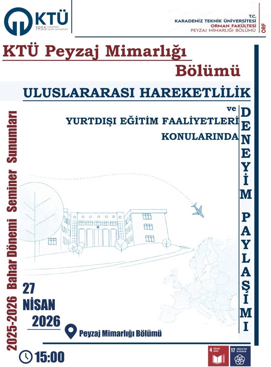 KTÜ Peyzaj Mimarlığı Bölümü tarafından düzenlenen “Uluslararası Hareketlilik ve Yurtdışı Eğitim Faaliyetleri Deneyim Paylaşımı” gerçekleştirilecektir.