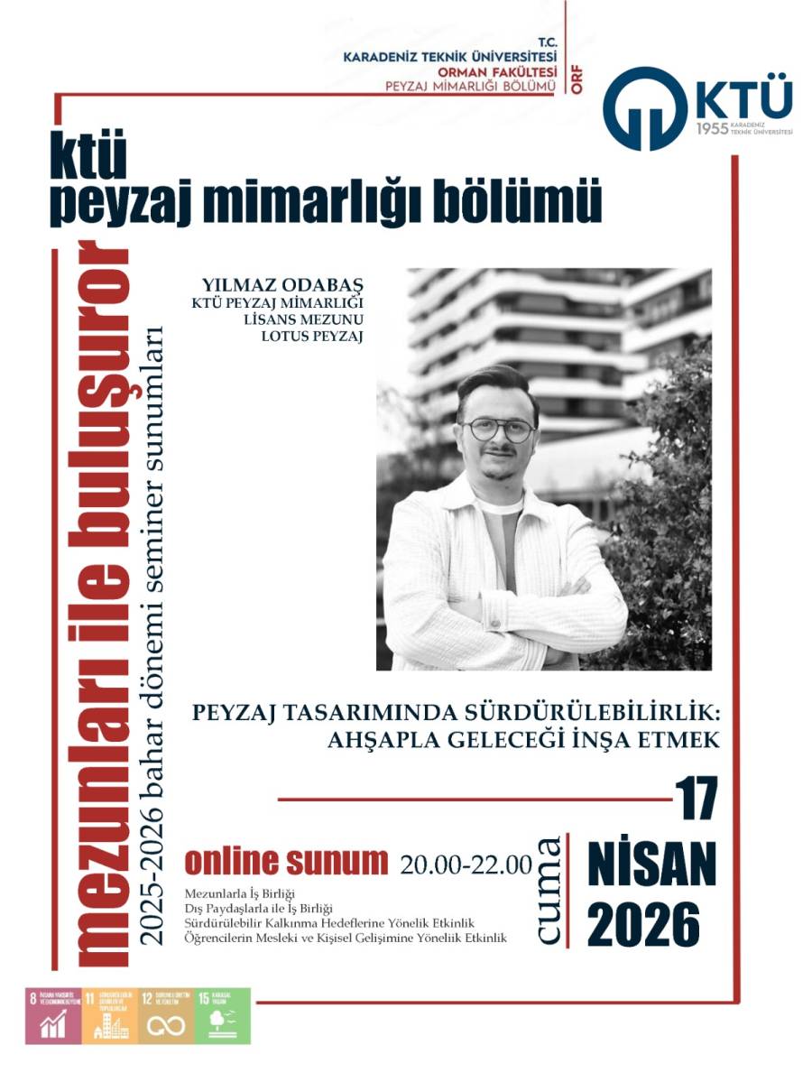 KTÜ Orman Fakültesi Peyzaj Mimarlığı Bölümü 2025–2026 Bahar Dönemi Mezun & Öğrenci Buluşma Seminerleri kapsamında düzenlenecek çevrim içi etkinliğimize sizleri davet etmekten mutluluk duyarız.