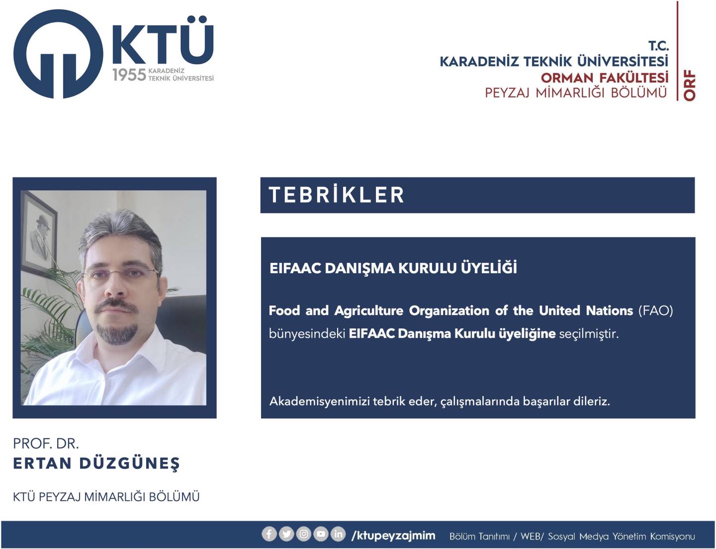 Bölümümüz öğretim üyesi Prof. Dr. Ertan DÜZGÜNEŞ, Food and Agriculture Organization of the United Nations (FAO) bünyesindeki EIFAAC Danışma Kurulu üyeliğine seçilmiştir. EIFAAC Danışma Kurulu, Avrupa genelinde iç su ekosistemlerinin korunması, su ürünleri yetiştiriciliğinin sürdürülebilirliğinin sağlanması ve bilim-temelli karar alma süreçlerinin desteklenmesi açısından önemli bir rol üstlenmektedir. Düzgüneş; kurulda sulak alanların yönetimi, korunması ve biyolojik izleme konularında akademik bilgi birikimi ve uygulama deneyimlerini uluslararası platformda paylaşacaktır. Bu kapsamda üniversitemizin uluslararası görünürlüğüne önemli katkılar sağlayacaktır.