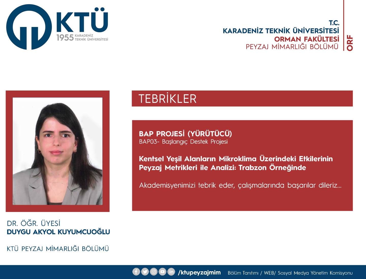 Bölümümüz Akademisyenlerinden Dr. Öğr. Üyesi Duygu AKYOL KUYUMCUOĞLU'nun yürütücüsü olduğu proje, BAP03-Başlangıç Destek Projesi desteği almaya hak kazanmıştır.