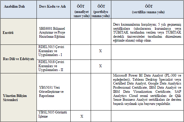Önceki Öğrenmenin Tanınması Kapsamında Belirlenen Dersler