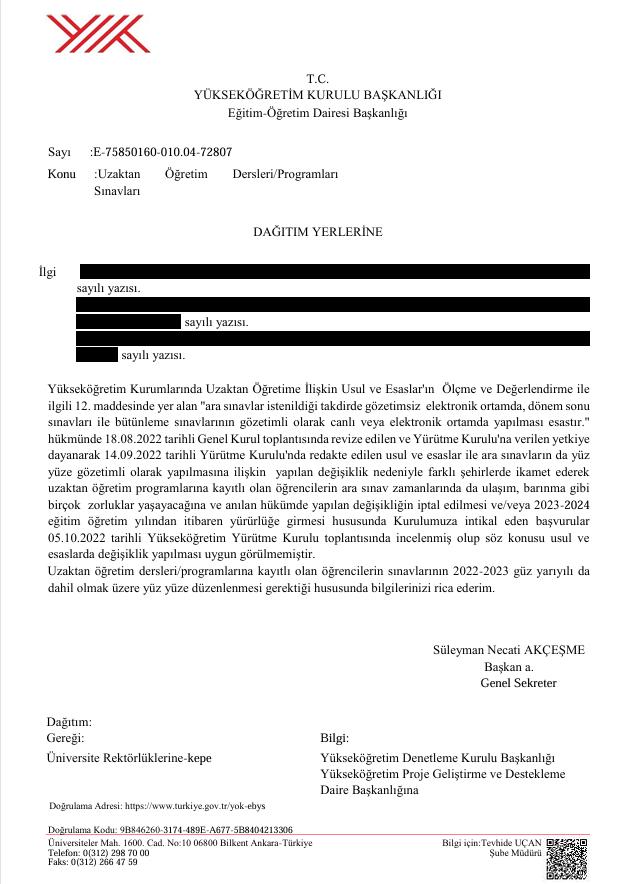 14.09.2022 tarihli Yükseköğretim Kurumlarında Uzaktan Öğretime İlişkin Usul ve Esaslar (Madde 12), YÖK Eğitim-Öğretim Dairesi Başkanlığının 72807 Sayılı Yazısı (aşağıda yer almaktadır) ve 16.06.2021 tarihli KTÜ Uzaktan Eğitimle Verilecek Derslerle İlgili Senato Kararı (C maddesi) gereğince Enstitümüz bünyesindeki Uzaktan Eğitim Programlarındaki tüm sınavlar (arasınav, final ve bütünleme), yüzyüze yapılacaktır. Tüm öğrencilerimize önemle duyurulur.