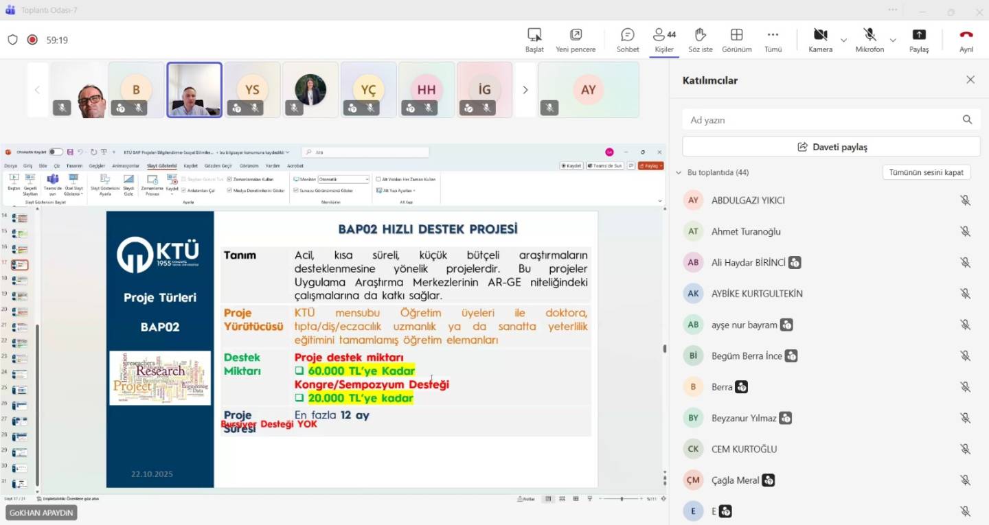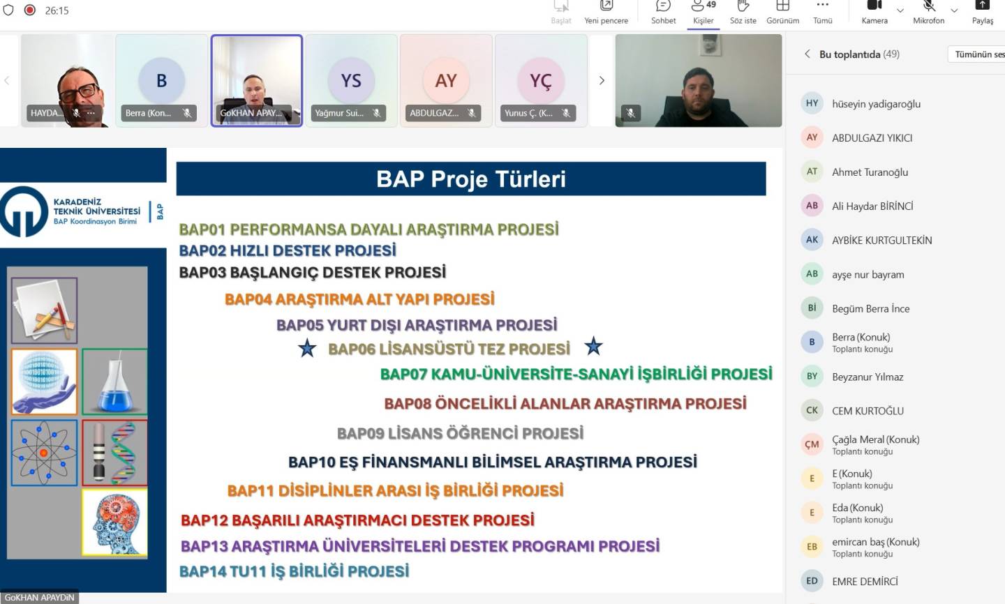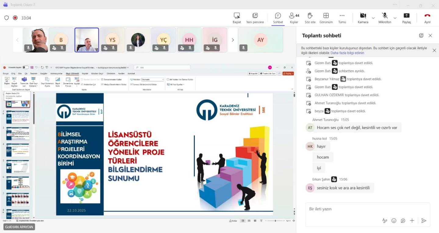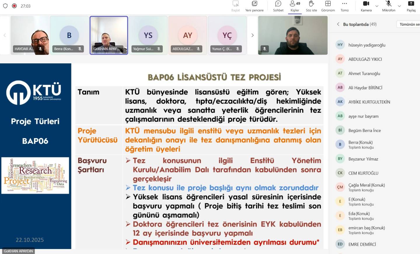 Lisansüstü öğrencilerine yönelik olarak, 22 Ekim 2025 tarihinde saat 15.00'te Birim Koordinatörü Prof. Dr. Gökhan APAYDIN’ın katılımı ile çevrimiçi (online) BAP Bilgilendirmesi Toplantısı gerçekleştirilmiştir. Toplantıda önce BAP destekleri hakkında ayrıntılı bilgiler verilmiş, ardından da katılımcılardan gelen sorular cevaplandırılmıştır.
