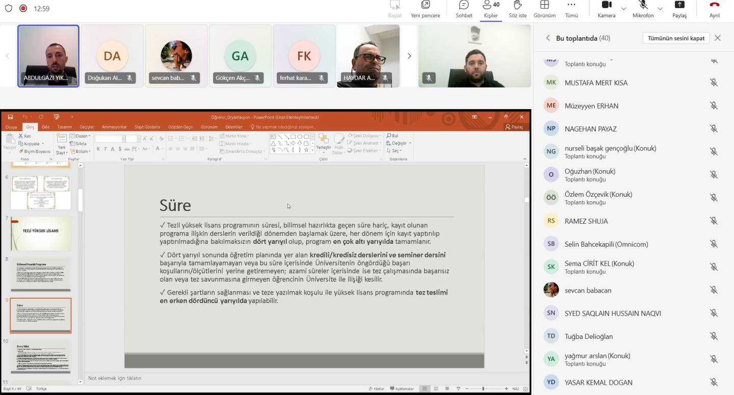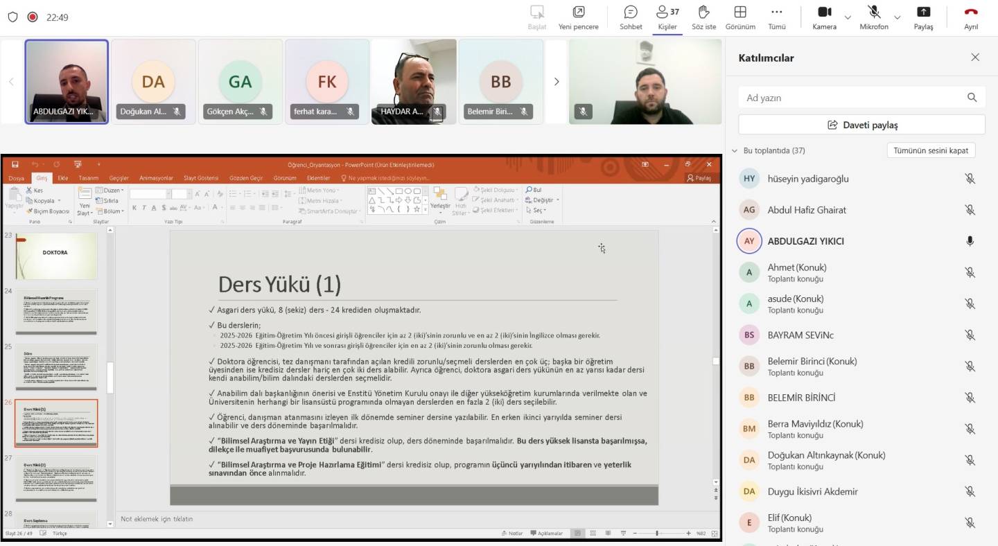 2025-2026 Eğitim-Öğretim Yılı Bahar Yarılında aramıza yeni katılan öğrencilerimiz başta olmak üzere tüm öğrencilerimize yönelik düzenlenen oryantasyon programında katılımcılara; tez teslim süreçleri, lisansüstü mevzuatı, öğrenci işleri, öğrenci değişim programları hakkında bilgiler verilmiş, ardından öğrencilerden gelen sorular cevaplandırılmıştır.