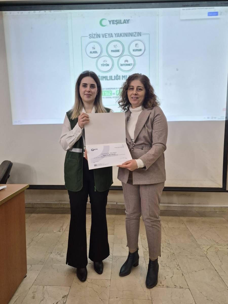 1-7 Mart Yeşilay Haftası kapsamında Fakültemiz ve Eczacılık Fakültesi İşbirliği ile Trabzon Yeşilay Danışmanlık Merkezi Sosyal Hizmet Uzmanı Duygu ÇOLAK tarafından "2025 Türkiye Tütün Raporu Işığı'nda Bağımlılıkla Mücadele" başlıklı söyleşi gerçekleştirilmiştir.