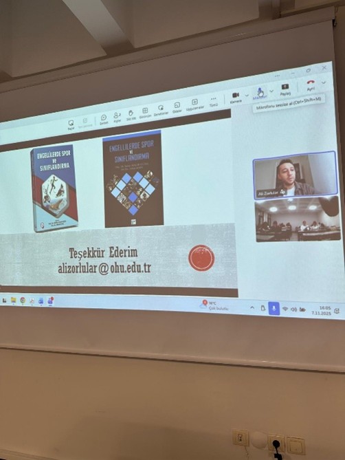 Bölümümüz 3. sınıf güz döneminde zorunlu olarak işlenen FTR-3007 kodlu Fizyoterapide Özel Konular dersi, fizyoterapi ve rehabilitasyon içerisinde fizyoterapi ve rehabilitasyon süreçlerinde özelleşmiş alanlara odaklanmaktadır. 07.11.2025 tarihinde yapılan derse davetli konuşmacı olarak sektör temsilcisi Dr. Öğr. Üyesi Ali Zorlular çevrimiçi olarak katılmış ve Engellilerde Spor ve Sınıflandırma konusunu anlatmıştır. Engelliliğin spor yapmaya engel olmadığını ve teşvik edilmesi gerektiğini anlatan hocamız bu bireylerin topluma kazandırılmasında bizlere düşen görevlerden bahsetti. Her bir engelli bireylerin kendi seviyesine uygun ve adil ortamda yarışabileceği bir spor dalı olduğunu belirterek, engel türüne göre hangi spora uygun olduğu ve paralimpik komitenin belirlediği sınıflandırılma yöntemlerinden detaylı olarak bahsetti. Sn. Zorlular’a katkılarından dolayı Karadeniz Teknik Üniversitesi Sağlık Bilimleri Fakültesi Fizyoterapi ve Rehabilitasyon Bölümü akademik personeli ve öğrencileri adına teşekkür ederiz.