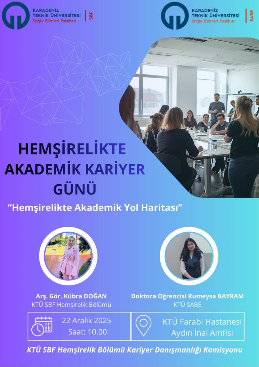 KTÜ Sağlık Bilimleri Fakültesi Hemşirelik Bölümü Kariyer Danışmanlığı Komisyonu tarafından düzenlenen 22 Aralık 2025 Pazartesi günü saat 10.00’da Farabi Hastanesi Aydın İnal Amfisinde gerçekleştirilecek olan Hemşirelikte Akademik Kariyer Günü "Hemşirelikte Akademik Yol Haritası" programına sizleri davet ediyoruz.