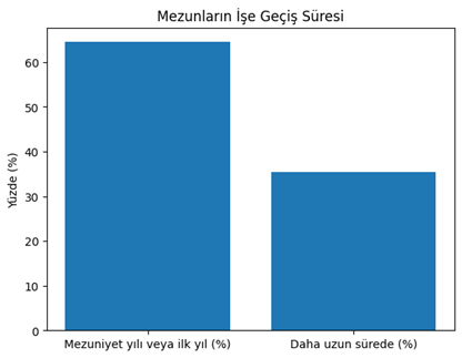 Mezunların işe giriş süreleri geniş bir dağılım göstermektedir. Bazı mezunlar mezuniyetten hemen sonra veya birkaç ay içinde işe girerken; bazı mezunların işe geçiş süresi daha uzun olabilmektedir. Bu durum; iş piyasası koşulları, sektör tercihleri, coğrafi hareketlilik, kamu sınav süreçleri ve bireysel ağlar gibi değişkenlerle ilişkili olabilir.