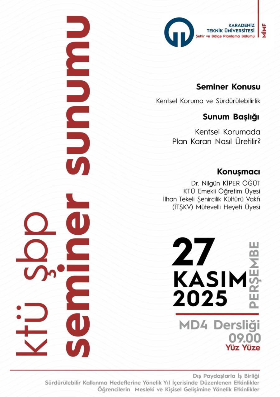 27 Kasım 2025 Perşembe günü saat 09.00-11.00 saatleri arasında, Karadeniz Teknik Üniversitesi Şehir ve Bölge Planlama Bölümü tarafından “Kentsel Korumada Plan Kararı Nasıl Üretilir” temalı bir seminer gerçekleştirilmiştir. Konuşmacı olarak katılan emekli öğretim görevlimiz ve KTÜ Emekli Öğretim Üyesi ve İlhan Tekeli Şehircilik Kültürü Vakfı (İTŞKV) Mütevelli Heyeti üyesi Dr. Nilgün Kiper Öğüt'e ve tüm katılımcılara teşekkür ederiz.