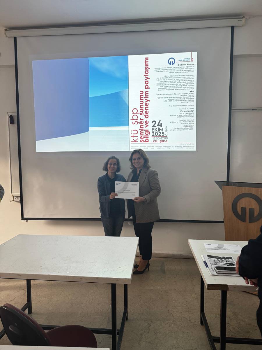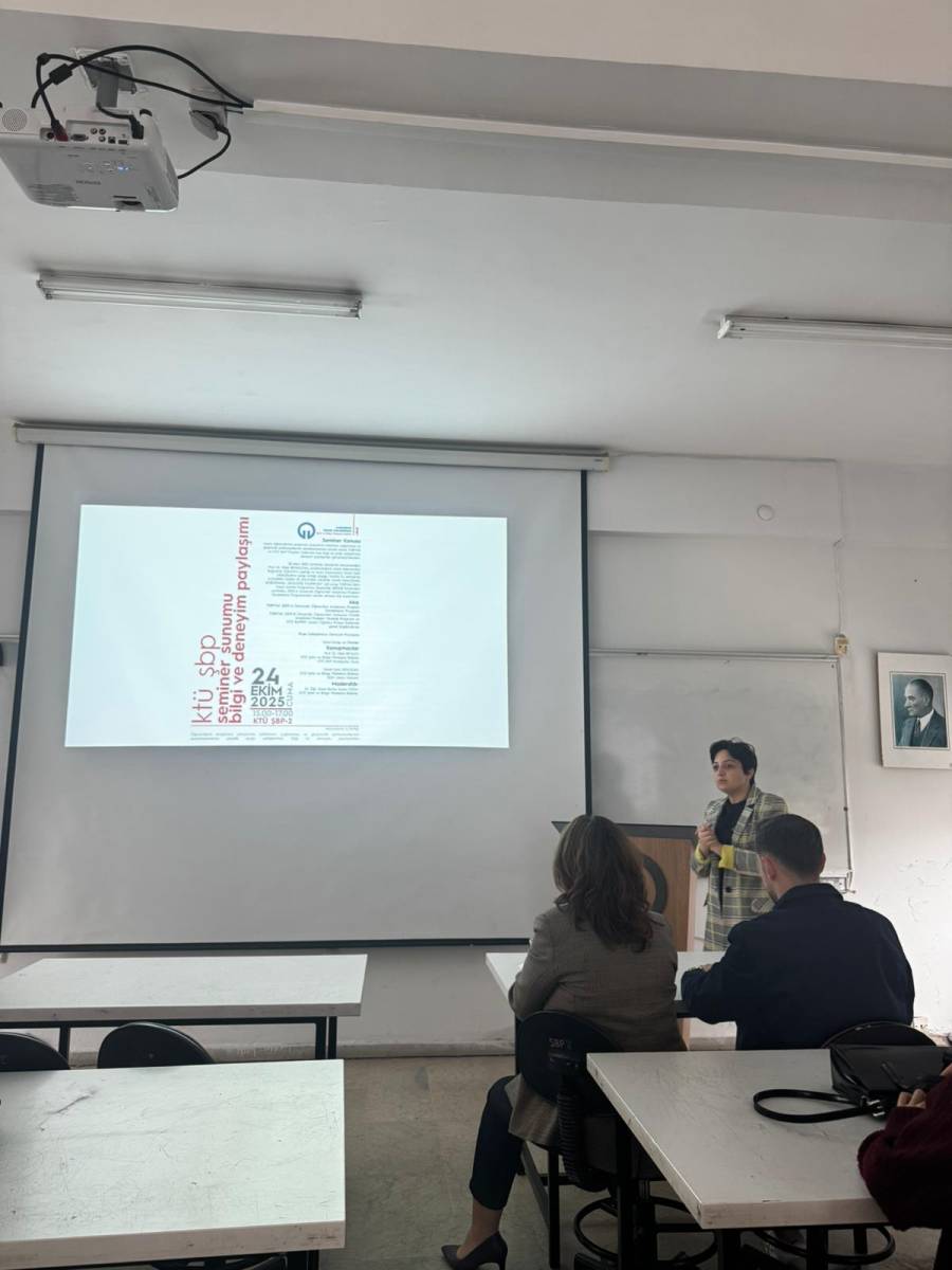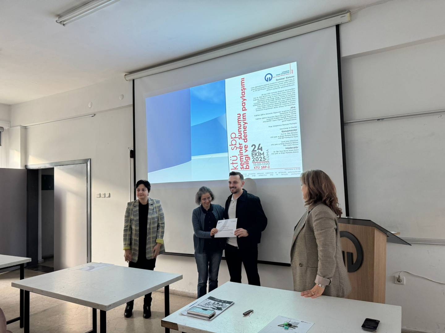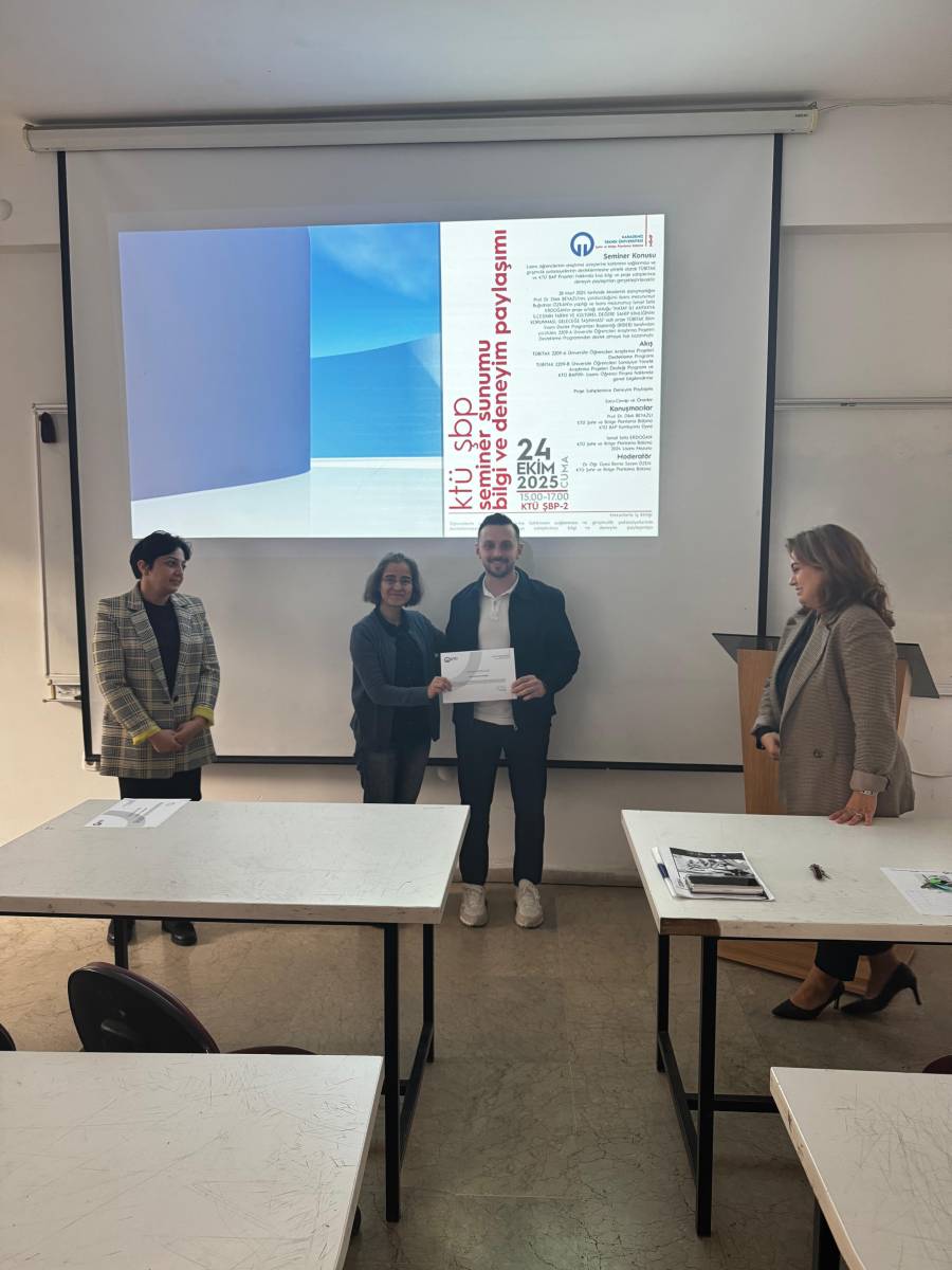 Dr. Öğr. Üyesi Berna Sezen ÖZEN?in moderatörlüğünde, Prof. Dr. Dilek BEYAZLI'nın ve 2024 Lisans Mezunumuz İsmail Sefa ERDOĞAN'ın katkılarıyla lisans öğrencilerimize yönelik bilgi ve deneyim paylaşımı etkinliği 24 Ekim 2025 Cuma günü 15.00-17.00 saatleri arasında KTÜ ŞBP-2 dersliğinde gerçekleştirilmiştir.